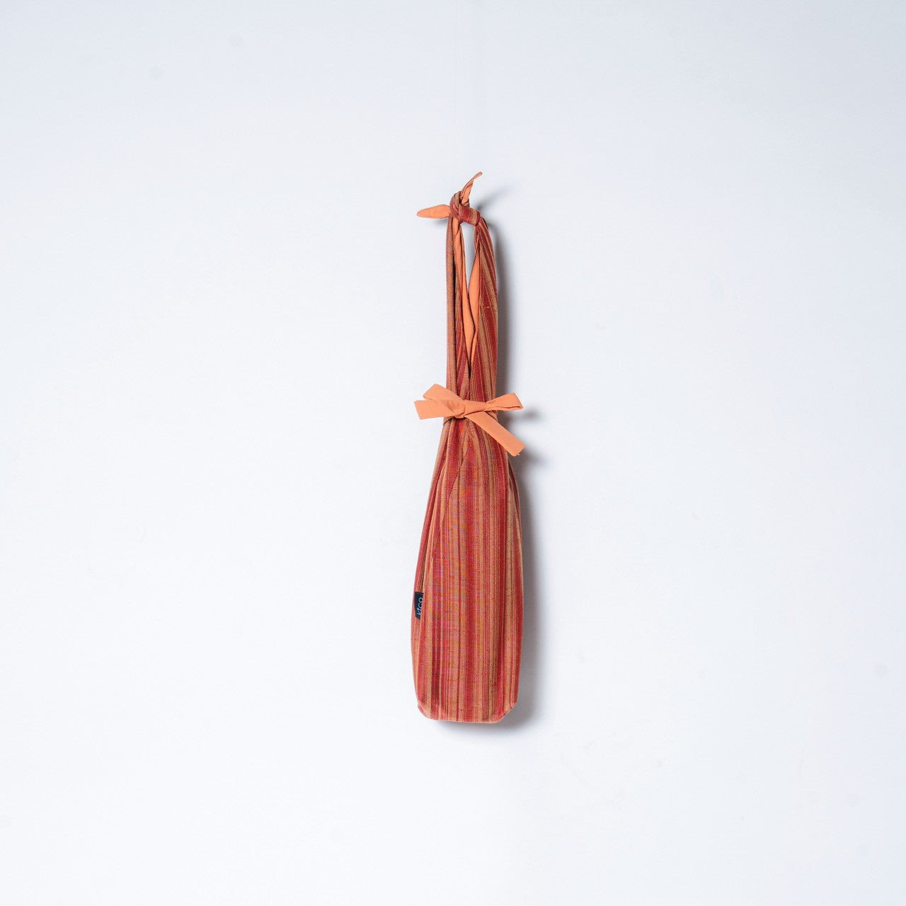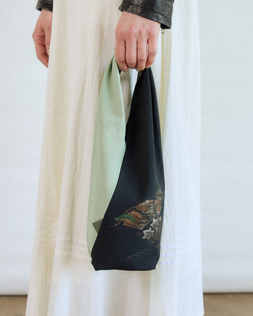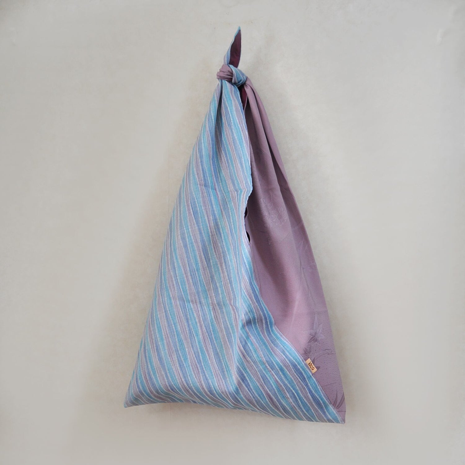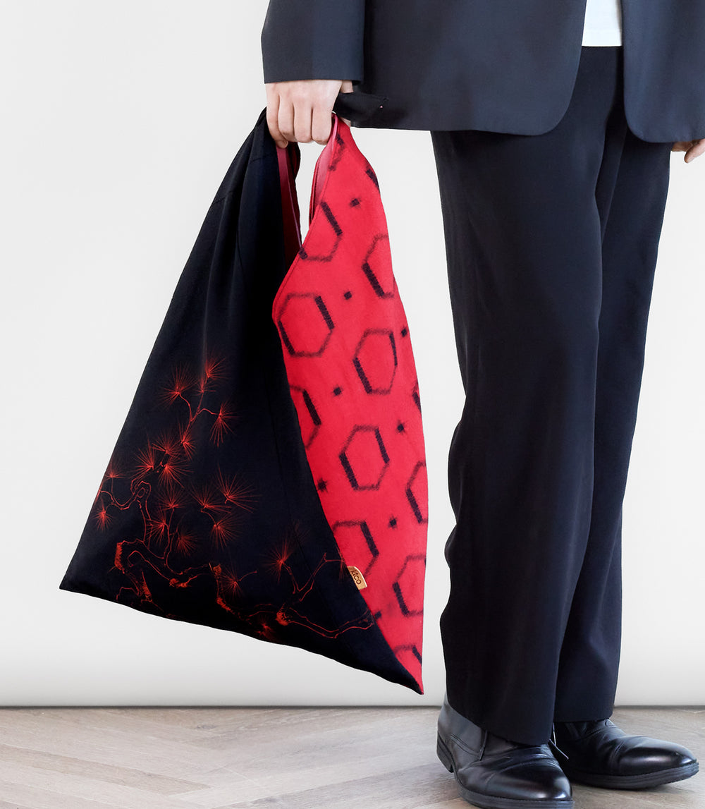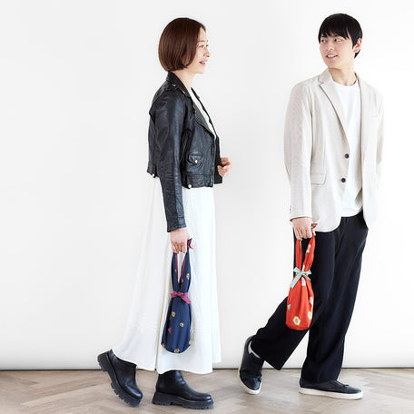 kicoのバッグは、アウターの上からでも肩掛けできるよう、持ち手の長さをしっかりと設計しています。オリジナルのパターンにより、日常のさまざまなシーンで使いやすい形に仕上げました。結び目の位置を変えることで、持ち手の長さを調整することができ、用途や季節に合わせて使うことができます。袋部分の容量もしっかり確保し、海外の方にも使いやすいサイズになっています。